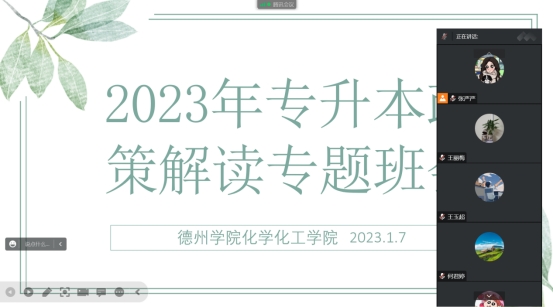 为确保2022届专科毕业生及时知悉专升本最新政策,进一步做好2023年专升本工作,1月7日,化学化工学院于腾讯会议召开专升本政策解读专题班会。本次班会由化学化工学院分管教学副院长、系主任、辅导员及2023届全体专科毕业生参加,会议由辅导员主持。