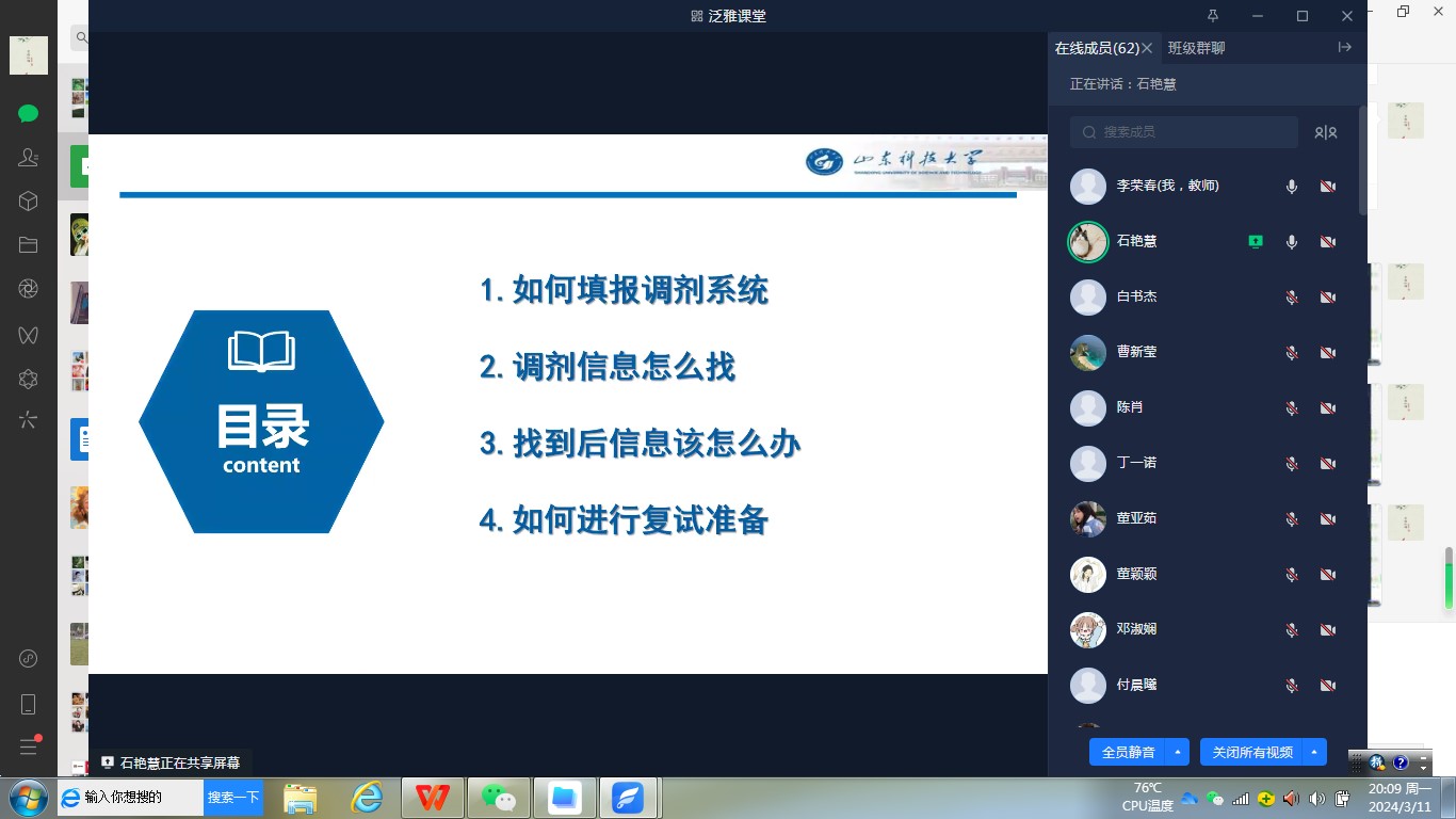 进行经验分享的三位同学分别是梁婧、石艳慧、曹新莹,均为研一在读研究生,三位同学主要在复试内容、复试注意事项、考前准备等方面进行了经验分享,叮嘱同学们仔细阅读所报考学校的通知公告,自我介绍、个人简历准备及跟导师邮件联系的注意事项,复试时证件、住宿、饮食和心态等准备和调节的方法。关于调剂,梁婧和石艳慧同学就调剂信息的查找、调剂系统的填报及调剂过程中自己具体的有效方法进行了分享和交流。