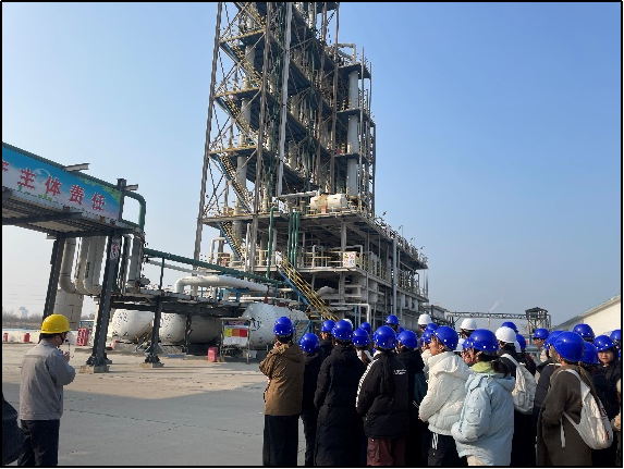在乐陵力维化学品有限责任公司生产车间,技术总工程师给同学们详细介绍了公司生产概况,并针对苯酚残液的资源化利用过程中涉及的精馏、直接催化燃烧处理VOCs废气、燃油供热、烟气集灰、脱硫以及污水处理等工艺流程和设备进行了详细的讲解(图2),使同学们对工业生产过程中的环境污染物产生环节及相应的废水、废气和固废处理措施有了更加直观和具体的认识。乐陵力维化学品有限责任公司成立于2014年,公司位于乐陵市循环经济产业园区内,国泰路以南,园区六路以北,为加快企业转型升级推进新旧动能转换,紧跟山东省“十三五”危险废物处置设施建设规划要求,达到危险废物“减量化、资源化、无害化”目的,自主开发了30000t/a苯酚残液资源化利用装置自产HW11危险废物资源化利用技术,资源利用率达到80%以上。