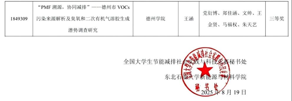 近日,“招行杯”第十八届全国大学生节能减排社会实践与科技竞赛决赛圆满落幕。betway西汉姆联官网刘文博老师指导的学生团队凭借作品《“PMF溯源,协同减排”—德州市VOCs污染来源解析及臭氧和二次有机气溶胶生成潜势调查研究》荣获全国三等奖。