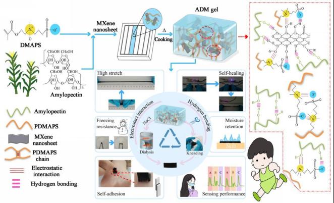 功能性聚合物通常具有优异柔韧性,在柔性电子器件、软体机器人等领域表现出巨大的应用潜力。随着资源日趋紧张、全球污染日益严重,功能性聚合物在使用完以后往往难以回收再利用,造成严重的环境污染,这不符合绿色可持续发展要求。因此,如何以绿色可再生的生物质资源为基础,发展具备可实现损伤再修复,尤其是能回收再利用、且综合性能良好的功能性聚合物材料引起了人们的广泛关注。淀粉因具有来源丰富、可再生、能降解、价格低廉、无毒、生物相容性好等特点而备受关注。由于其上述特点,近年来淀粉被不断的研究开发以满足可持续发展要求。然而淀粉的机械性能往往较差,单一成分的淀粉不适合在柔性电子器件、软体机器人等领域的应用。
