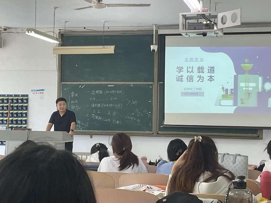 为进一步加强学院学风建设,营造良好学习氛围,严肃考风考纪,6月29日,化学化工学院开展“学以载道,诚信为本”诚信考试主题班会,本次班会由年级辅导员主讲,全体学生参加。