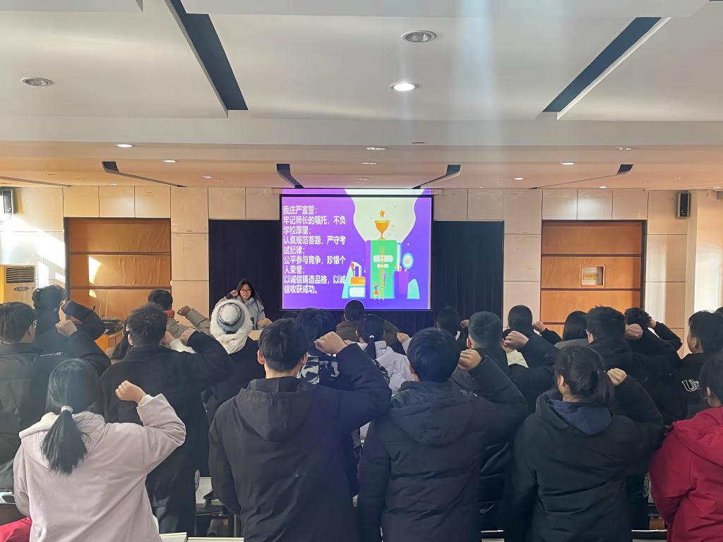 会上,辅导员组织全体学生重点学习了《中华人民共和国刑法修正案(九)》《德州学院关于加强学风建设的十项规定》《德州学院学生违纪处分条例》《德州学院学生管理规定》等文件中关于考试违纪处分的相关内容,结合典型警示案例,讲述了考试作弊的危害性和严重性,呼吁全体同学树立诚信意识,杜绝考试作弊行为,认真复习备考,以优异成绩为本学期画上圆满的句号。会后,全体学生进行诚信考试的宣誓,并签署了《诚信考试倡议书》,誓以自身严正营造良好考风。