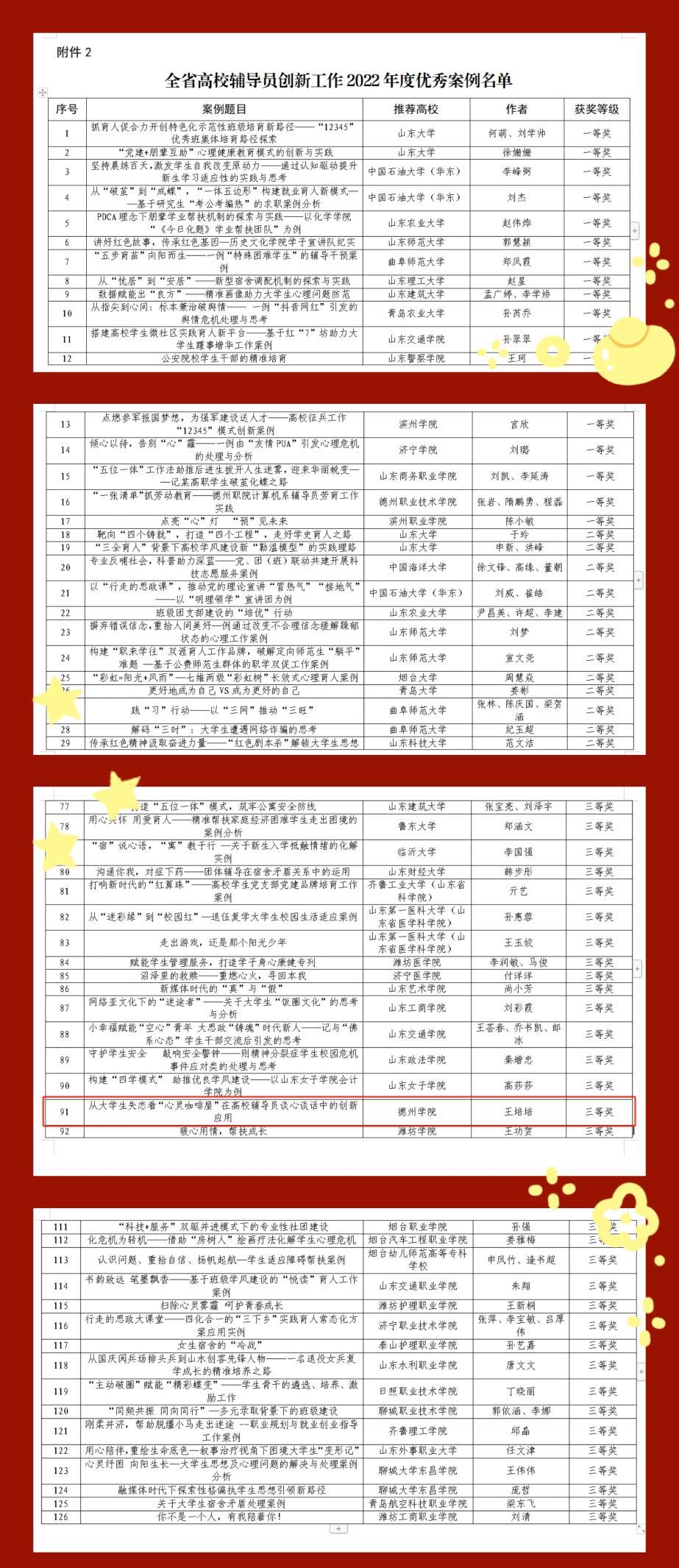 近日,中共山东省委教育工委公布了全省高校辅导员创新工作2022年度优秀案例评选结果。经各高校推荐申报、专家评审等环节,betway西汉姆联官网辅导员王培培老师的工作案例《从大学生失恋看“心灵咖啡屋”在高校辅导员谈心谈话中的创新应用》入选全省高校辅导员创新工作2022年度优秀案例,荣获三等奖。