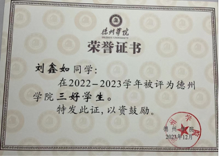 学习态度严肃认真,学习目的明确,态度端正,勤奋刻苦、锐意进取,善于总结学习经验,不断改进学习方法、理论联系实际,通过不懈努力,取得了优异的成绩。荣获2022-2023学年德州学院“综合一等奖学金”、2022-2023学年德州学院“三好学生”、2023-2024学年德州学院“优秀大学生奖学金”、2023-2024学年德州学院“综合二等奖学金”。