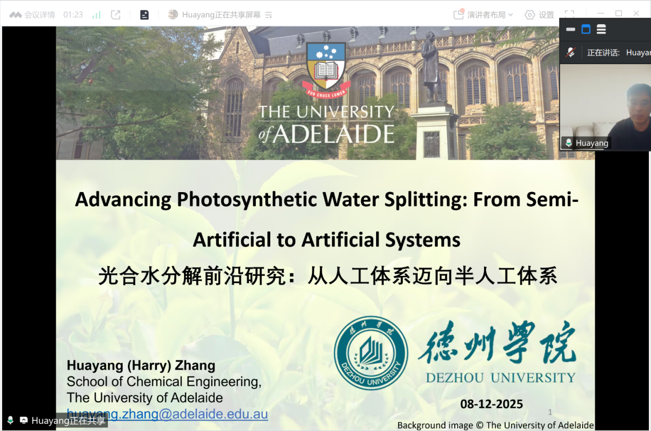 12月8日,化学化工学院邀请了澳大利亚阿德莱德大学化学工程学院DECRA研究员张华阳研究员通过腾讯会议平台,以《光合水分解前沿研究:从人工体系迈向半人工体系》为题作学术报告。学院负责人、硕士生指导教师、青年骨干教师、研究生参加此次交流会。