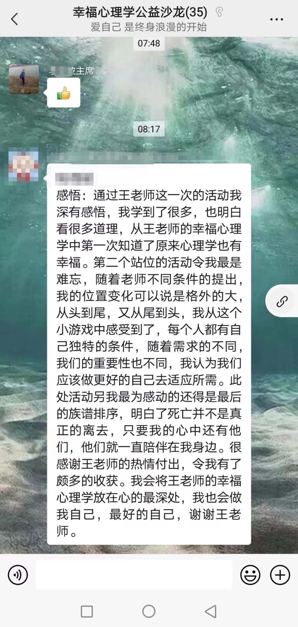 团体成员一一分享参加此次活动的感想和收获。大家纷纷表示,通过本次心理沙龙,爱上了心理学,更加客观认知自己,做真实、完整且有力量的自己,未来活成一道光,照亮更多人。