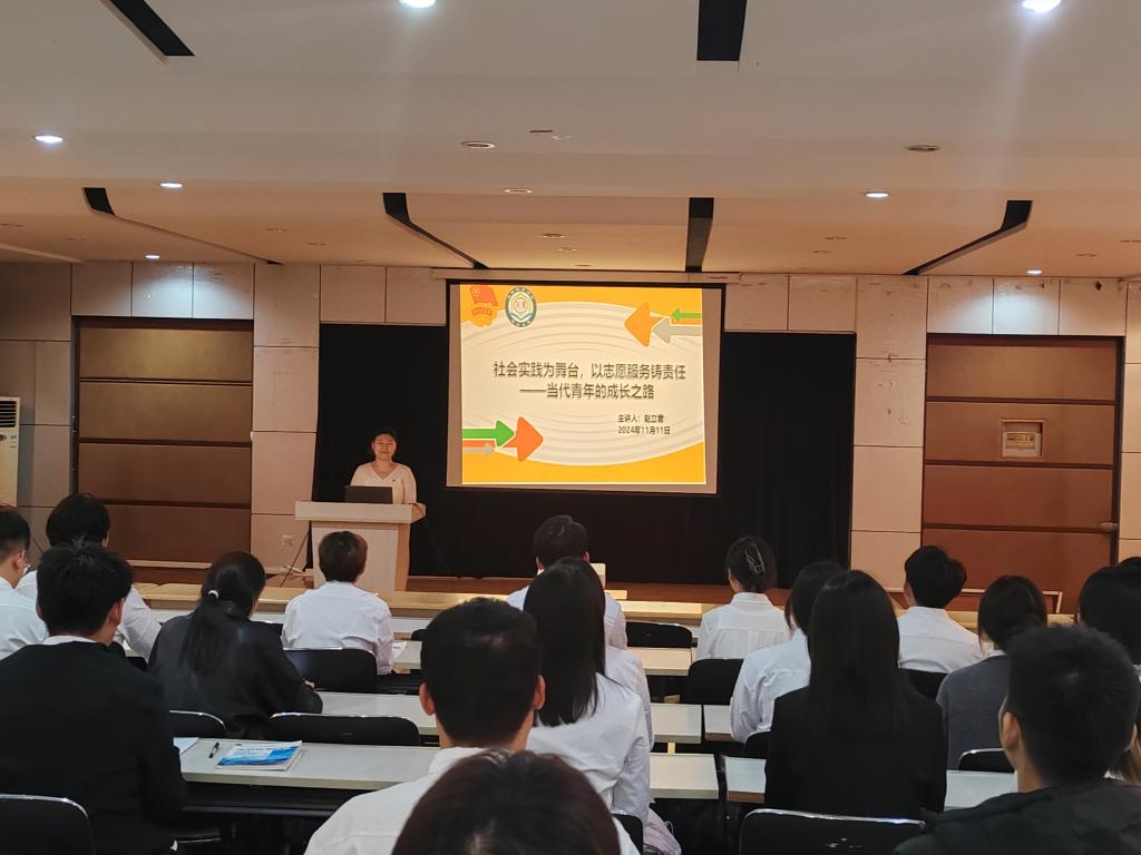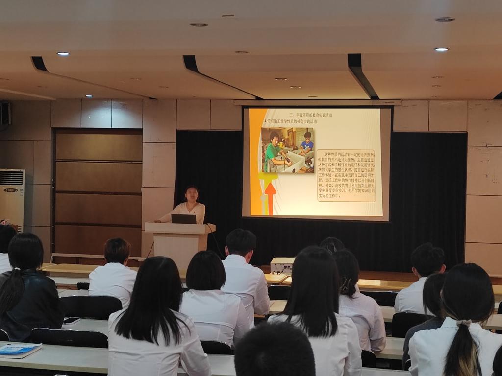 主讲人围绕“社会实践”主题,就“大学生社会实践活动的概述”“社会实践活动的设计与开展”两个方面介绍实践活动。随后,详细介绍了“百万大学生进社区”、“青鸟计划”、大学生暑期“三下乡”等社会实践项目,展示了“化学化工学院“正青春社会实践志愿服务队”、“清水绿滩一叶舟”暑期社会实践队取得的实践成果,鼓励同学们积极参与到社会实践与志愿活动中,为建设繁荣富强中国贡献自己的力量。