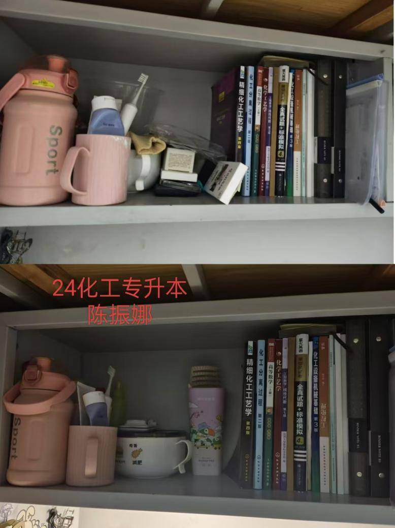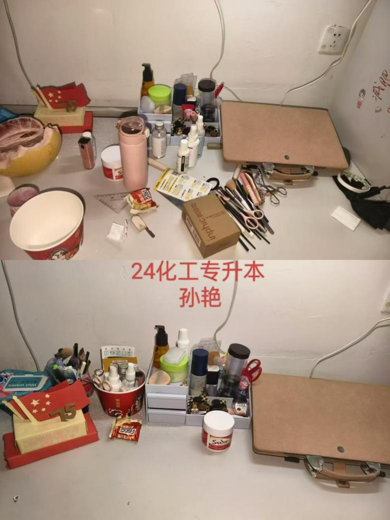 为了丰富大学生活,增进宿舍感情, 2024 年 10 月 14 日 - 10 月 18 日,化学化工学院举办“我的地盘,百变‘纳’物”活动。引导同学们发挥创造力,利用身边资源进行宿舍装饰与物品收纳,培养环保意识与团队合作精神,同时缓解宿舍杂乱问题,为同学们营造整洁舒适且富有创意的生活空间。